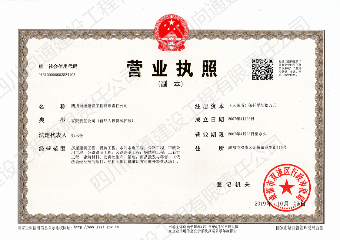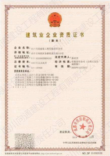 四川向通建設工程有限責任公司 四川向通建設工程有限責任公司成立于2007年,注冊資本金5060萬元,是一家專業從事瀝青混合料生產、專業分包以及市政道路、公路、路基工程專業施工建設的企業。公司注冊地址及生產廠區位于成都市雙流區金橋鎮茂生街115號,總占地面積約120畝;辦公地址位于雙流區海濱城海濱廣場7座11樓。公司生產廠區(雙流金橋)現有LB-5000型瀝青混合料拌合樓1套,每小時瀝青混合料生產量可達380噸。此外,根據項目需要,公司在多地建立4000型拌合站以服務施工(廣安齊福、達州、綿陽等),每小時瀝青混合料生產量為320噸。各種國內外道路施工機械:攤鋪機、壓路機、銑刨機、灑布車、封層車、吊車、拖車、等70余臺,可滿足各種道路施工需求。公司近100輛保溫運輸車輛均安設保溫板、加塞保溫棉、覆蓋棉絮和隔熱防水雨篷,有效減少瀝青混合料在運輸過程中的溫度流失進而保證瀝青路面的施工質量。 公司目前擁有眾多優(yōu)秀的技術人才,成熟的市場渠道,良好的企業聲譽。現有各專業施工人才共計79人;5支專業的施工班組可根據現場的具體情況制定實施性施工方案。今后公司將竭誠為各界客戶提供出色的產品和服務及具有競爭性的價格和具有創(chuàng)新精神的高效解決方案。 公司曾經榮獲:新津鄧雙段被新津縣政府評為“優(yōu)良工程”;雙流宗申大道被雙流縣政府評為“優(yōu)良工程”;成都后花園被成都市政府評為“重合同守信譽單位”;被三一重工評為“有遠見單位”。并在2018年1月被中國五冶集團評為“優(yōu)秀供方”;同年3月被四川交投評為2017年度“優(yōu)秀合作單位”的榮譽。榮譽的背后是我們公司所有員工堅持不懈的努力。 作為現代化的企業,公司將以技術為切入點,以信譽為支撐點,以市場為著眼點,促進管理創(chuàng)新和技術創(chuàng)新。因此我公司能在短時間內迅速發(fā)展成為一家擁有各類中大型施工機械設備的公司。在今后的工作中我們將借用現代電子信息溝通的便利為公司的發(fā)展助力,同時將秉承發(fā)揚以往的團結拼搏精神,推動公司成為“快穩(wěn)型”發(fā)展的企業。 在未來的發(fā)展過程中,四川向通始終秉承“以質量求生存,以信譽求發(fā)展”的企業管理理念,以“啟后為先創(chuàng)佳績,爭做路建行業標”的企業宗旨與建設單位建立合作關系,創(chuàng)造更加輝煌燦爛的明天! 四 川 向 通 建 設